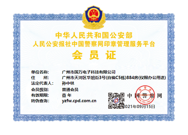 2021年9月15日,廣州市國萬電子科技有限公司(國萬科技KWOKMAN)因在2010-2021年經(jīng)營期間,信譽良好、無經(jīng)營異常、無重大負(fù)面輿情,符合中國警察網(wǎng)印章管理服務(wù)平臺推介規(guī)定,現(xiàn)已被納入印章管理服務(wù)平臺推介目錄,同時被授予了“會員單位”免審辦理資格。