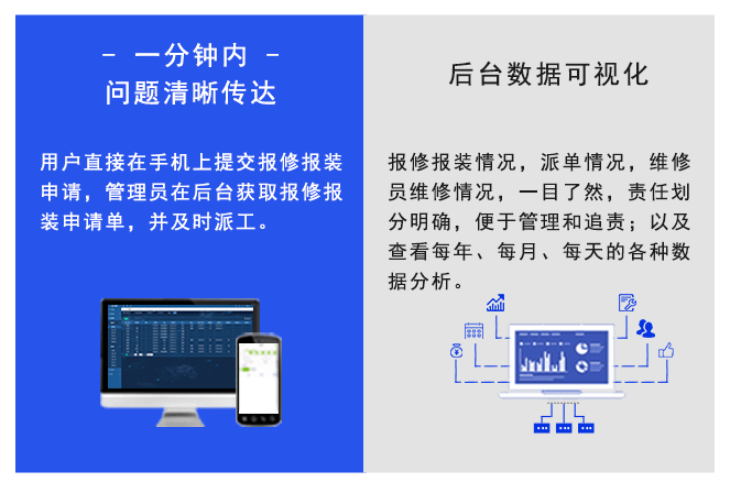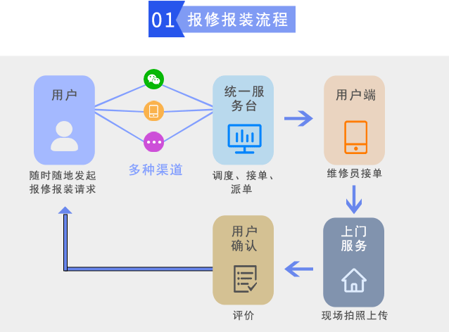 在線報(bào)修報(bào)裝系統(tǒng),可幫助企業(yè)實(shí)現(xiàn)輕松、規(guī)范、細(xì)致的報(bào)修、派單、接單、維修報(bào)裝、評(píng)價(jià)等一體化管理工作,提高管理效率、實(shí)時(shí)掌握、準(zhǔn)確、全面的報(bào)修報(bào)裝進(jìn)度,高效控制報(bào)修報(bào)裝全部過程。