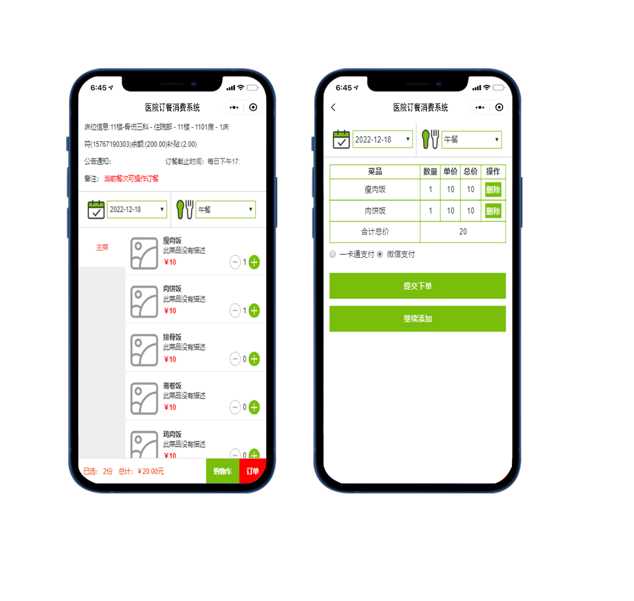 3、在醫(yī)院,可支持病人通過綁定病床的二維碼掃碼訂餐,可以直接選擇相關(guān)科室,可設(shè)置下單對應(yīng)的床位號。支持微信、支付寶支付?;颊咝枰軈^(qū)分普通餐、VIP餐、營養(yǎng)餐,能顯示圖片,能顯示食材。